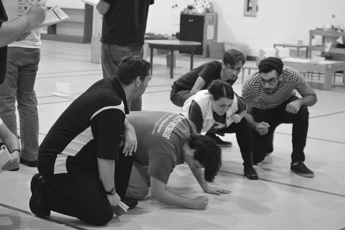 We've moved rehearsal spaces again, this time setting up for a single night in the Fellowship Hall of the Presbyterian Church. We start rehearsal with warm ups; Derek leads the cast through various exercises designed to help them relax and get more into character. Though warm up exercises can be silly – "You are all now sea cucumbers," Derek tells them as they sway gently back and forth – they help actors to focus and let go of personal stress, while getting the body ready for the demands of performing.
